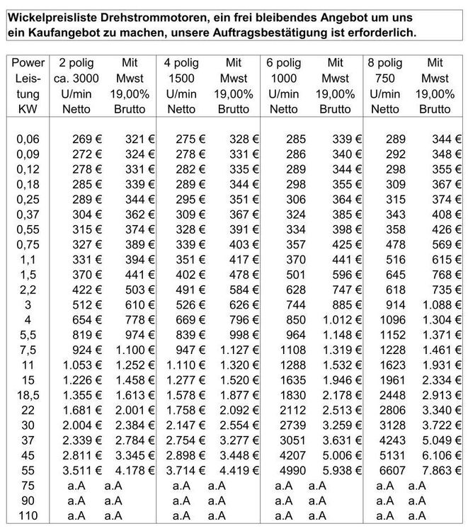 Die neue Wickelpreisliste 1-2025 ist da, auf der AQ Pluss Motoren Nisterberg (WW), der Internetseite, schon veröffentlicht.
